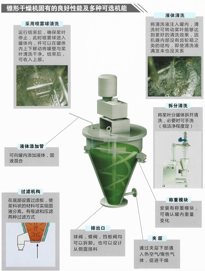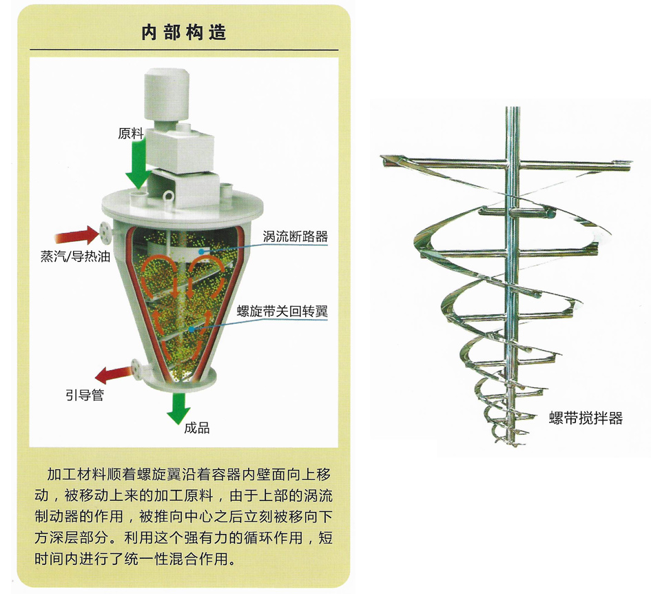 There is a small gap between the spiral strip rotary wing and the inner wall of the conical vessel. The driving part of the cylindrical wing is designed in the upper part of the top plate, and there is a vortex suppressors and blades inside. The upper part has a simple bearing seal assembly and the material is discharged from the lower valve.